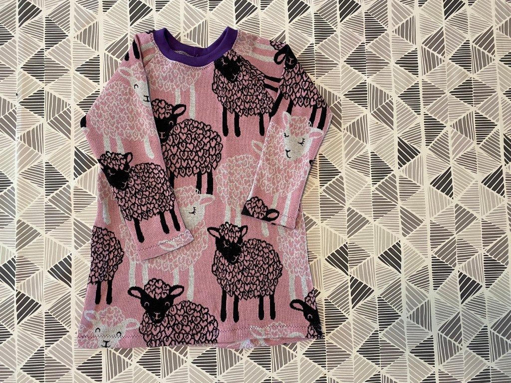 For første gang har jeg sydd med et Minikrea-mønster, og valget falt på raglankjolen deres. Kjolen ble sydd i størrelse 3 år (98 – 104) av bomullsjaquard (100 % bomull) fra Paapii design som ble kjøpt via Kreativ Mormor sin nettbutikk. Til kjolen gikk det omtrent 70 cm lengde i full bredde (150 cm). Halsribben er sydd av en rest fra Stofflykke. Jeg gjorde ingen endringer på mønsteret, og brukte det mest som en anledning til å bli kjent med symønster fra Minikrea. De tingene jeg vil være obs på dersom jeg skal benytte et av deres mønster igjen er følgende:
